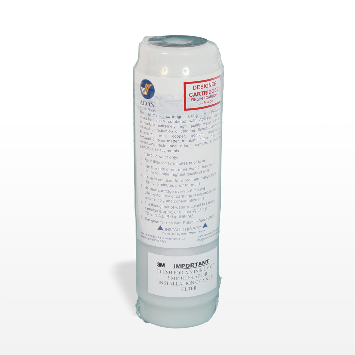 The Resin/Carbon cartridge is one of the most effective cartridges to use for the reduction of heavy metals from the water supply. These include fluoride, ammonia, iron, copper, lead, sodium, magnesium, calcium. The Resin/Carbon cartridge life expectancy is between 4–6 months or 816 Litres and is dependent on the quality of the water supply and the consumption rate. The Resin/Carbon cartridge is Australian made and has been tested on Australian water.